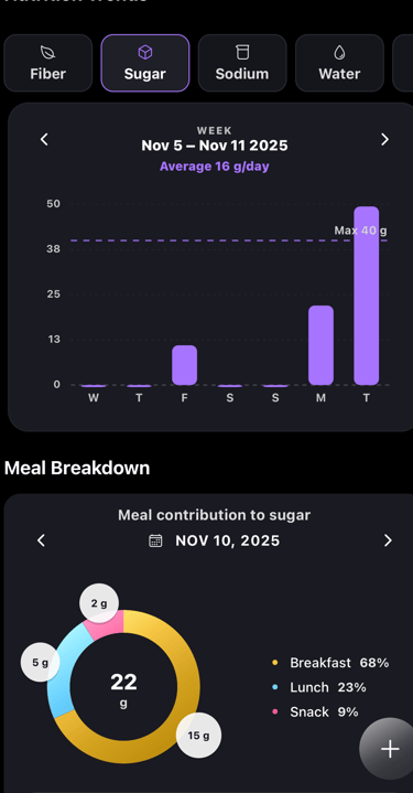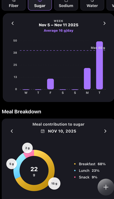 Get a detailed breakdown of your protein, carbs, sugar and fiber intake, including cholesterol, saturated and unsaturated fat, and more.